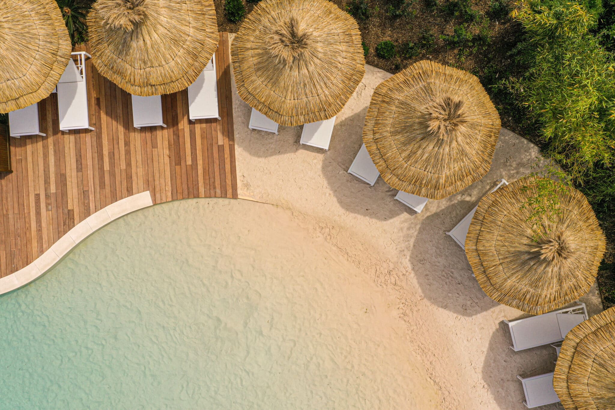 - La Roya, hôtel 4 étoiles membre de Small Luxury Hotels, a opté pour nos parasols tropicaux face à la mer, offrant une vue imprenable sur l’Île de Beauté.
